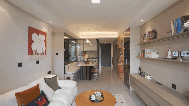 餐厅也做了创新设计,为了满足多人用餐需求,做了一个靠墙的沙发。