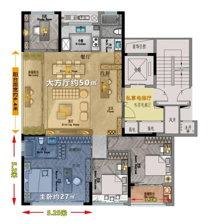 主卧5.25米X5.2米,尺度极其方正。