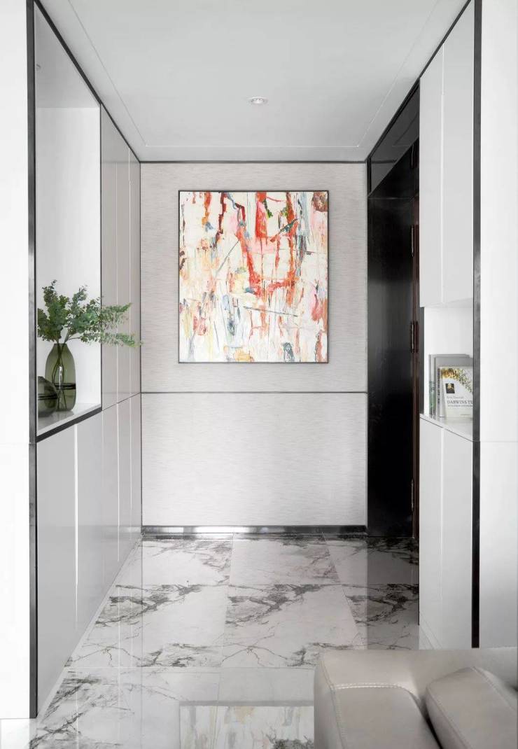 透过鞋柜看向过道,门全部做了到顶的处理,中间的腰线在公共开放区域是整体贯穿的元素,并结合柜门的开启高度,硬包的中线高度等等做了一个整体的联系。