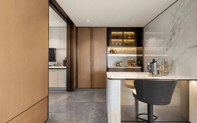 室内装标当然也超高,客厅是奢石背景墙,厨房是嘉格纳五件套,建面约192方的户型更夸张,厨房和客餐厅之间还专门做了一个独立的岛台空间,奢石岛台、一整面墙的收纳空间,全都是交付标准。