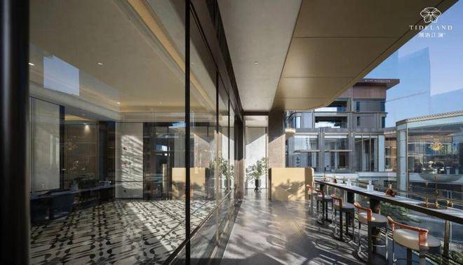 就像沿街这幢楼的架空层,就做得特别妙,它是会客主题的,楼下可以随便坐坐,大面落地窗外是潮语江澜府特地打造的沿街花园;楼上则做出了各种小尺度空间,有包厢式的,有半敞开的,还有像露台一样的,能俯瞰街景。