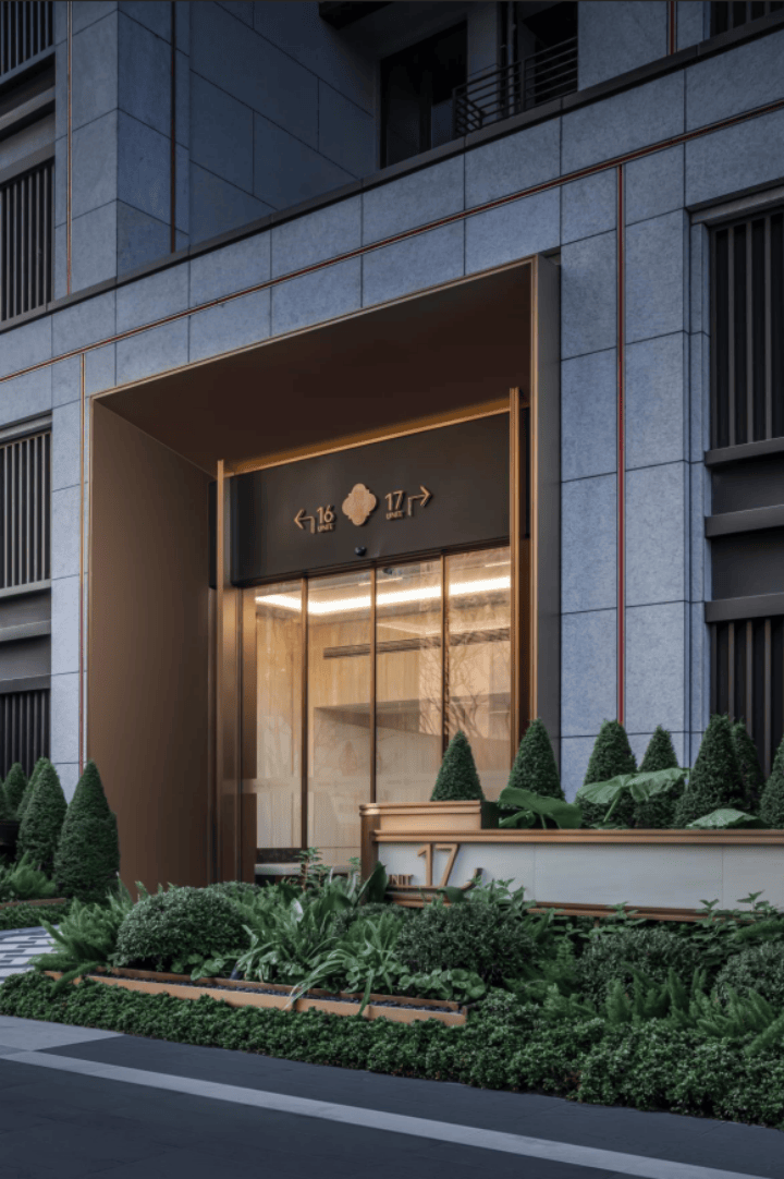 外立面上,项目立面以海派风格为主,采用石材,铝板,辅以部分真石漆,铺以横向铝板线条,通过对材质细部的精细化设计,真实还原海派立面的摩登风格。