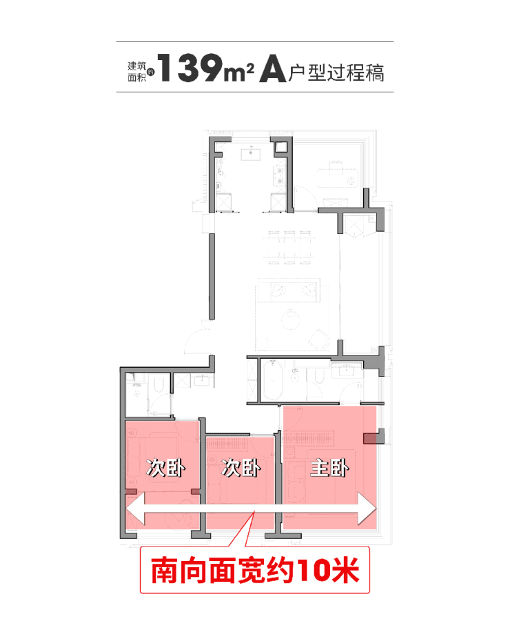 南向面宽10米,侧向总面宽14.1米。两个转角飘卧室。双阳台,其他房间全飘窗赠送。除了西边,另外三面几乎全是窗。看中庭景观,不到约140㎡的户型竟然能配浴缸!