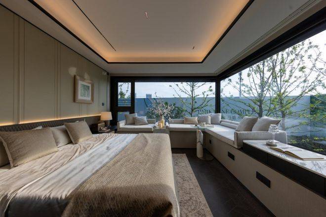 2# 号楼的边套主卧户型配置 270° 环幕飘窗,不仅延伸空间尺度,更将水岸、园景 “框” 成私藏壁画。晨间,阳光透过飘窗铺满床榻;深夜,枕着河风与月光入眠,这是专属建面约 165㎡的 “观景特权”