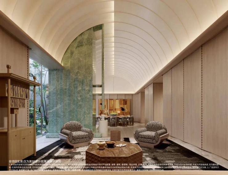 内外双重门厅景墙运用了约1000方顶奢才会用上的月光米黄石材,还是更费料的弧形石材,搭配香槟金线条,与爱马仕全球旗舰店的双曲面叠墙造景手法如出一辙。