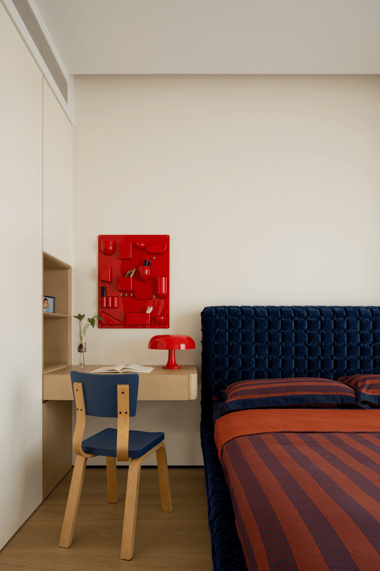中央的B&B Camaleonda模块组合沙发,以岛状布局重构空间逻辑,双向陈设的低椅背设计。一面朝向书柜电视墙,一面衔接餐厨区。让场景切换随心意而生,既保持空间通透感,又以功能分区提升使用效率。