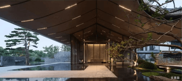 门庭之后,踏水归廊。以宋代「曲水流觞」的雅集中汲取灵感打造的「入园过渡空间」,归廊两侧是浅滩水景以手工雕刻的「安哥拉黑光面水切景石」形成「如波浪般的弧形纹理」,当水流经「潺潺轻响」行走其间,仿佛置身于「万家明月悬 秋浦,千尺飞虹锁暮流」的诗意场景。