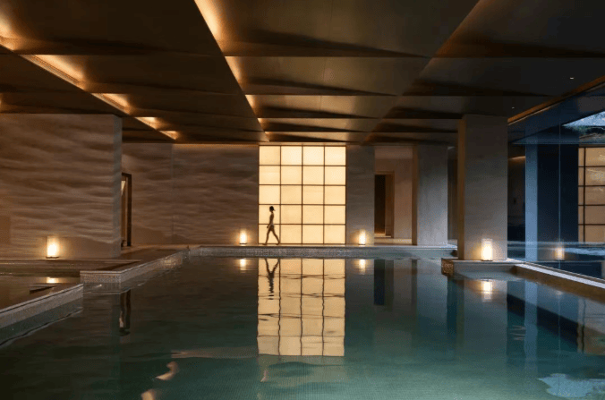 大尺度落地窗,与下沉庭院无缝连接,将窗外的山石、松影与飞瀑引入室内。每一次畅游,仿佛流动于山水长卷之中。整个泳池空间全部采用“香槟金”马赛克铺装,加上度假风情的休憩区,以及疗愈按摩系统,酒店式尊崇的舒适感扑面而来。