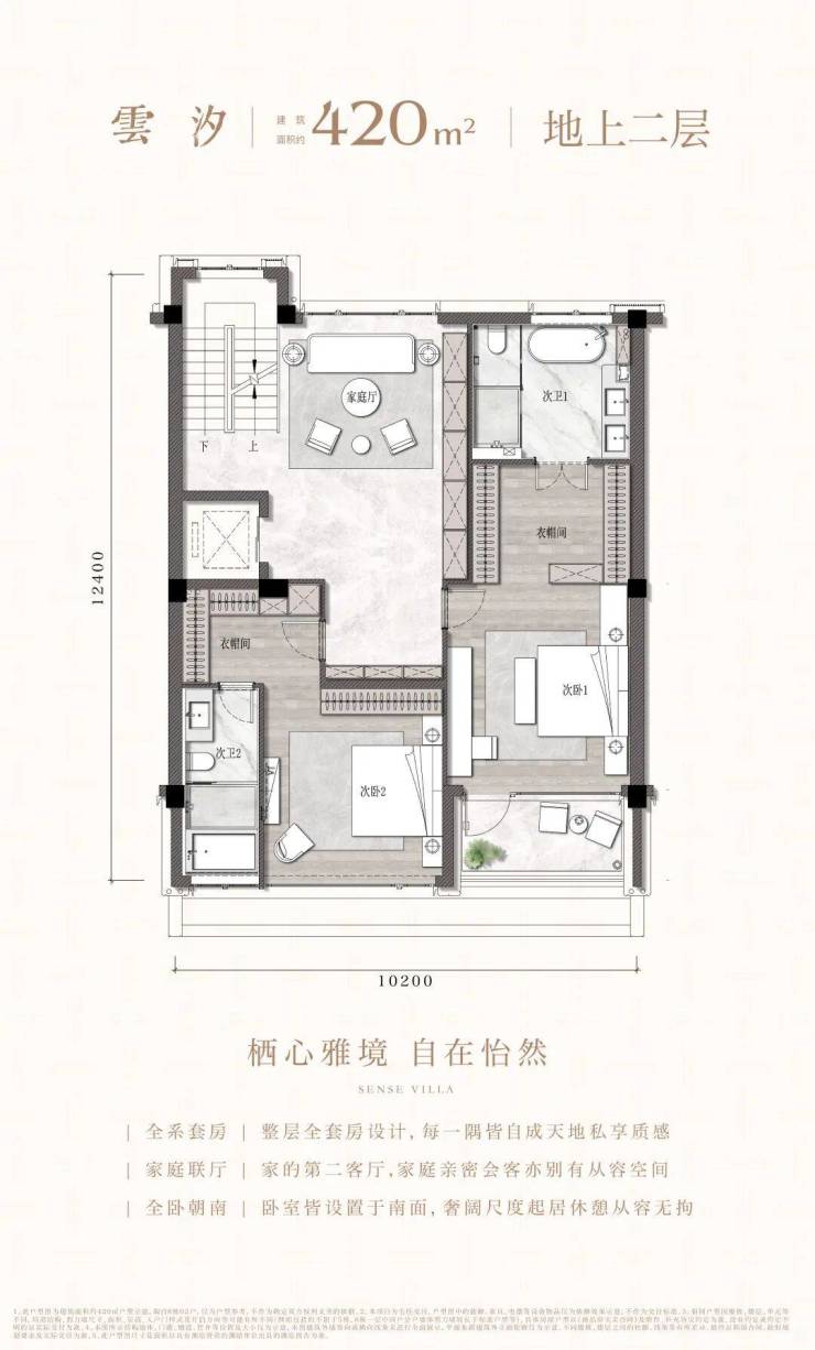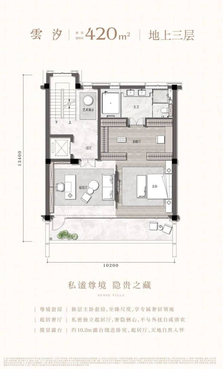 叠墅纵向空间上,功能立体分层、动静分离,上下叠皆拥有独立庭院,且下叠地面首层挑高至约3.55米,中上叠会客层亦挑高至约3.45米,全系户型皆奢享挑高约7.2米居下空间。