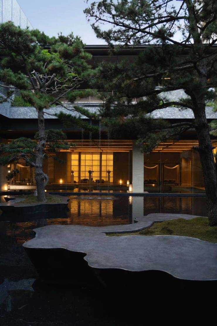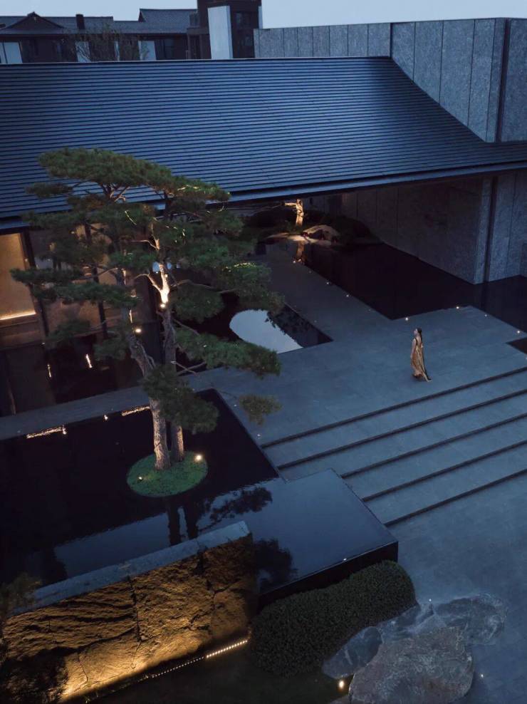 五株黑松以苍劲之姿构成「黑松叠景」,每一株都是跨越山河的生态艺术品,在古朴素简的山水画卷中,感受现代东方下的半隐秘境。