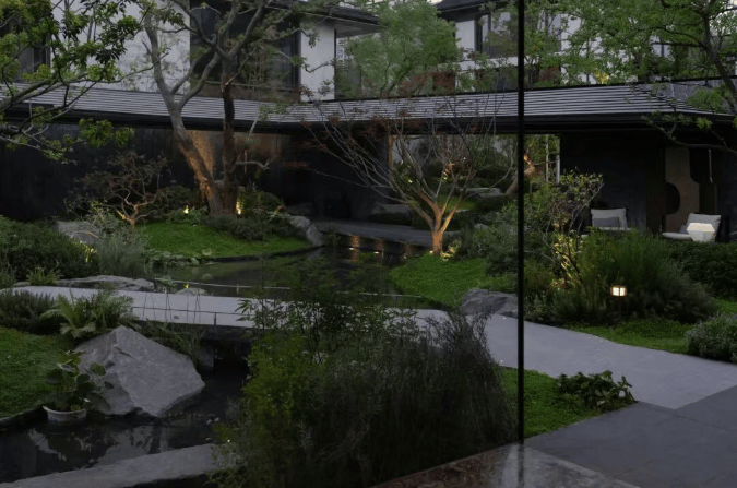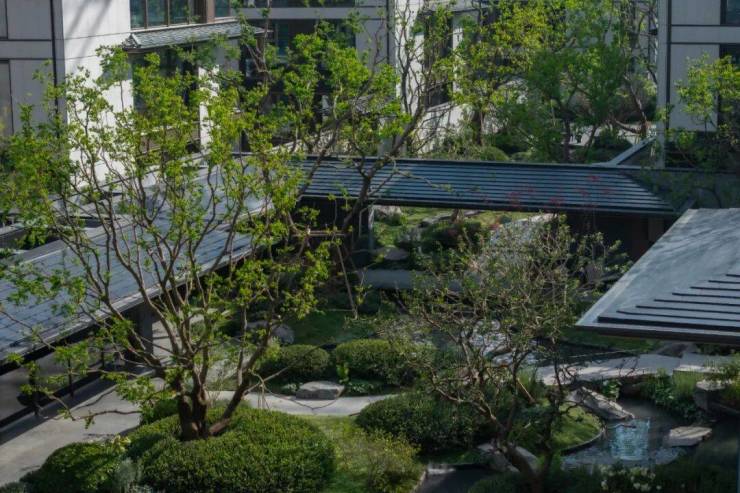 向内渐行是社区的核心景观观景台--望月桥以叠石、理水、建筑、花木四大元素构建「四水归堂」的风雅之景。