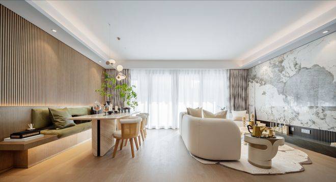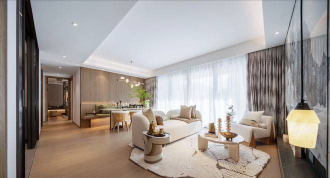 仁恒·溪棠建筑面积约119㎡户型空间整体以大地色为主色调,搭配暖咖与水绿色,温柔舒适的包裹感如烟弥散,恰似秋日的温存唤醒居家的愉悦与归属感。