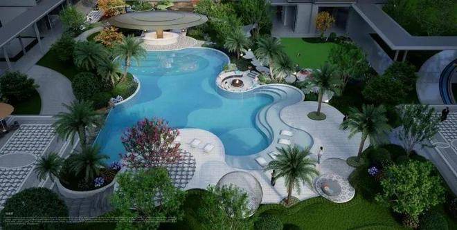 穿门而入,迎宾水院的风景很美,曲径通幽,步移景异。更亮眼的还有异形“蓝宝石”戏水池。