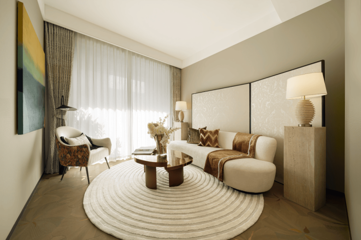 如果说240㎡「天幕臻境」是为女性审美量身定制的雅柔诗篇,以 “轻盈”和“悦己” 为理念,用柔和光泽晕染空间肌理,以温润触感包裹日常时光,将艺术级的雅致与柔美刻进每一处细节;那么 252㎡「江幕艺境」便是自然与空间的共鸣之作,以空中露台为媒介,让江风穿堂、霞光入户,将江景的壮阔与露台的静谧融为一体,勾勒出江与空间沉浸式互动的极致氛围感。