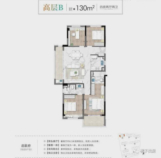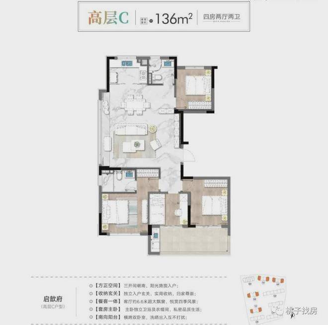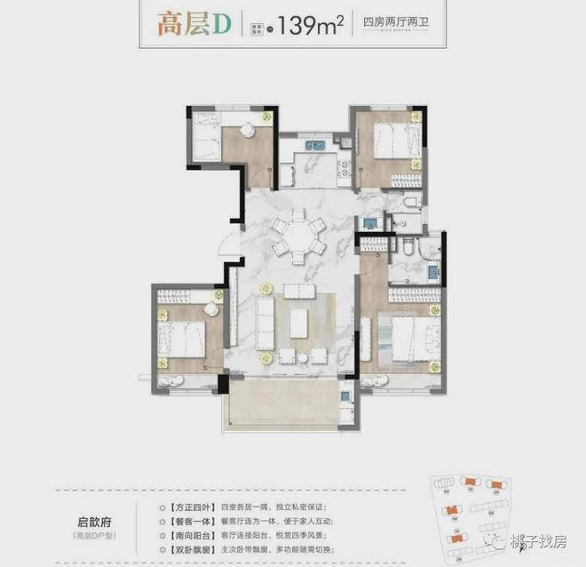 户型方正,经典四叶草户型,大尺度客餐厅,双阳台,超高得房率80%-95%。