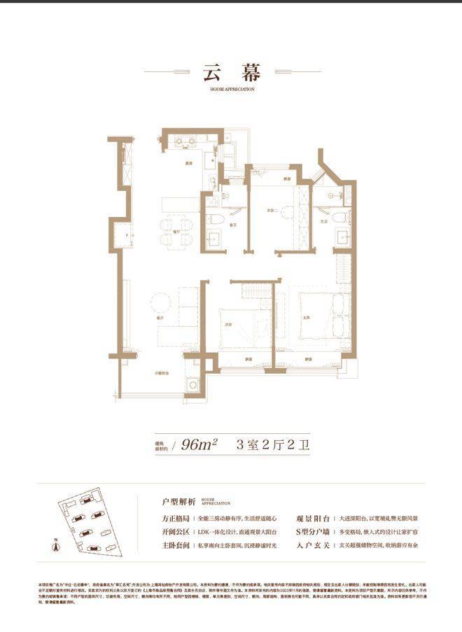 建面约96㎡3房,充分从居住者的角度考量生活动线、舒适度与生活感。S型的分户墙,褪去呆板,为家具预留更多的空间;LDK一体化的设计打破空间局限,解锁更多的生活场景,也拉近家人间的距离;主卧套间自在独处,生活的优雅时刻尽显……