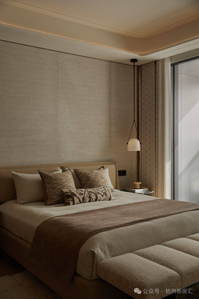 安璞 | 效果图卧室空间亦毫不妥协,主卧采用Poliform定制衣柜,次卧及功能间均配备定制衣柜,兼顾审美与实用收纳。项目还广泛运用旭格系统门窗(部分)、摩根全屋智能、梵蒂斯铸铝门及KFV智能门锁,从静音、安防到智能控制,全面构建安全、便捷、宁静的居住体验。
