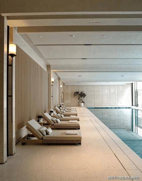 水面是一整块被驯服的黑绸,完整地盛着天花落下的暖光。光坠入水中并不刺眼,反而晕开成一片温润的琥珀色,随着水波微微地晃,像醒着的梦。池底的马赛克映着光,成为一片模糊而闪烁的星空。