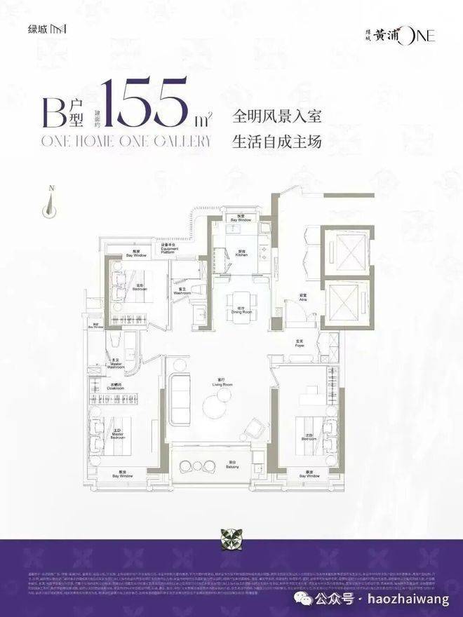 提供建面约155㎡三房和193㎡四房两种户型,均采用全边套设计,南北通透,配备嘉格纳厨电、智能家居系统。45