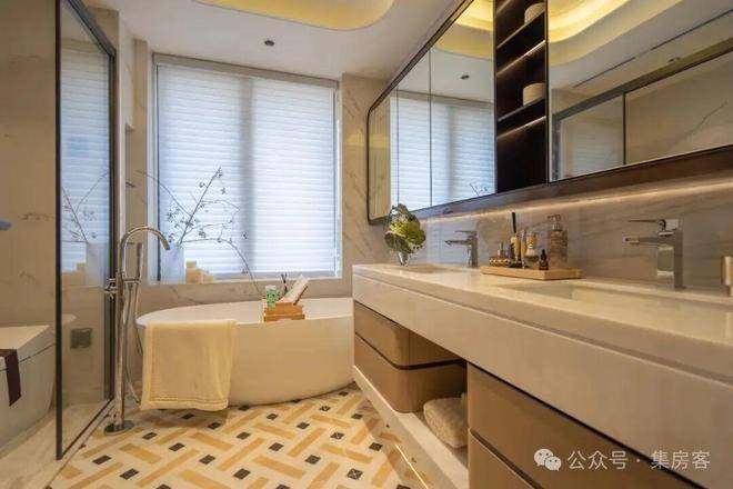 博世五件套、其中冰箱是博世8系最高顶配,全嵌入式、全进口的。还有方太万元侧吸油烟机,爆炒辣椒也不用担心跑烟。空调、厨余处理器、净水器等,也都包在交付标准内;卫生间:镜柜配置美妆冰箱,守护主人高端的护肤美容产品;