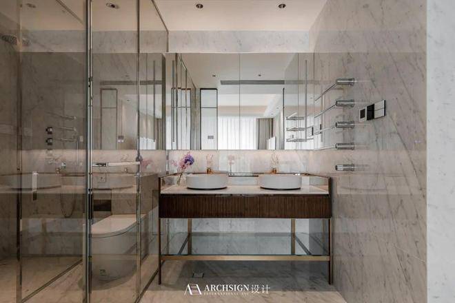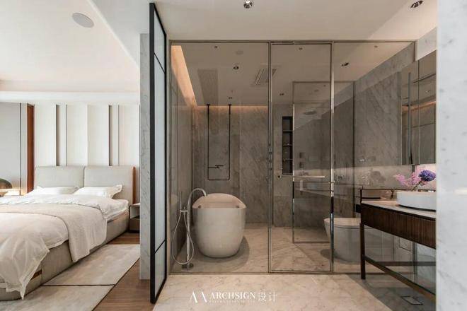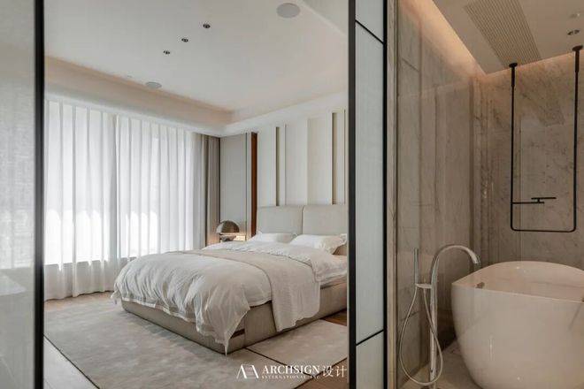 杭 州 壹 号 院主卫以优雅的白色大理石铺装而成,纵向延申的浴缸可以俯瞰整个奥体板块以及钱江新城。