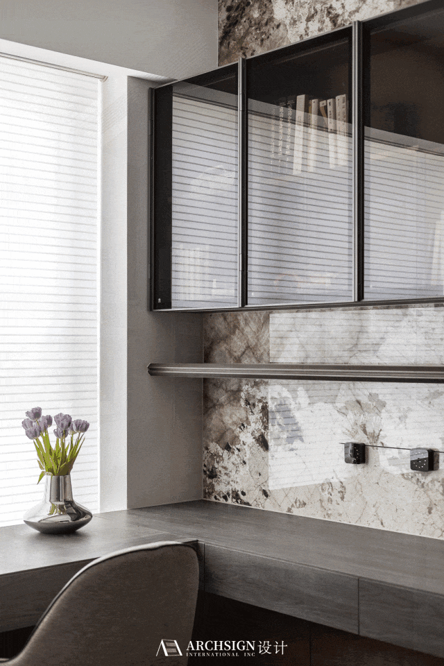 The Nobilia integrated kitchen in Germany features painted door panels that are custom-made for the One Yard residential complex in Hangzhou. The combination of the imitation granite color and dark wood grain enhances the overall look, and is complemented by the dark glass cabinets from Nobilia.