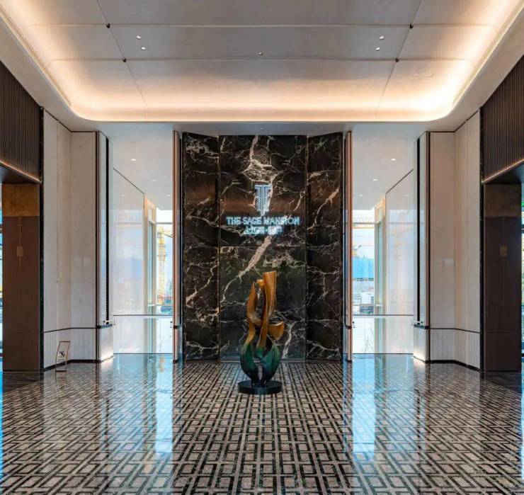 HWCD 团队以国际视野扎根江南文化,用奢石铺陈出显性的高端质感,空间里随处可见的玉石元素,呼应“玉以载德”的中式底蕴,水纹图形点缀其间。