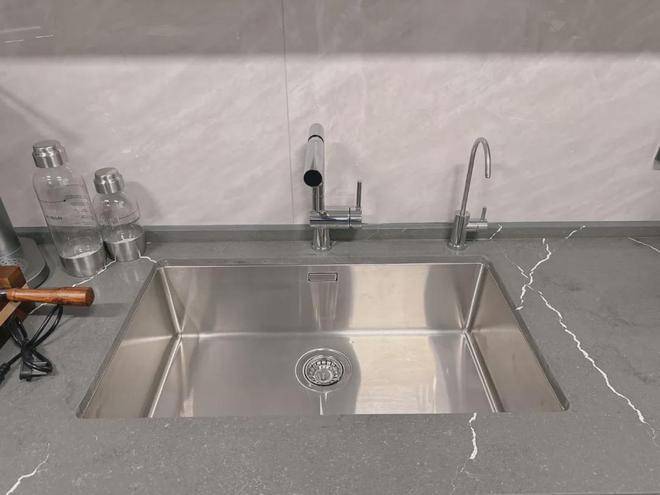 水槽采用的是铂浪高不锈钢大单盆:配合抽拉式水龙头,轻松洗刷。底下安装了末端净水康丽根或同等品牌。