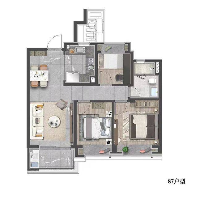建面约99㎡的三房设计,在空间上使用功能更加多样化,一站式解决了家庭生活的所有功能,优化居家动线,大大提升空间的居住体验。