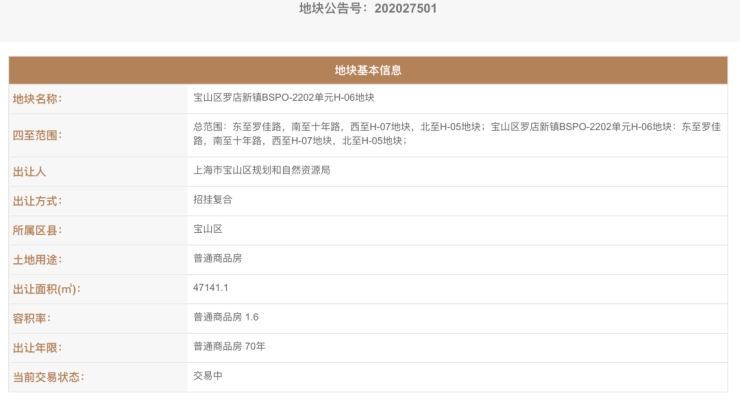 2021年2月2日,宝山区罗店新镇BSPO-2202单元H-06地块总价19.65亿元成功出让,折合楼板价26052元/㎡,溢价率13.26%,比一路之隔的「先进玲珑悦府」楼板价低出约3000元/㎡。