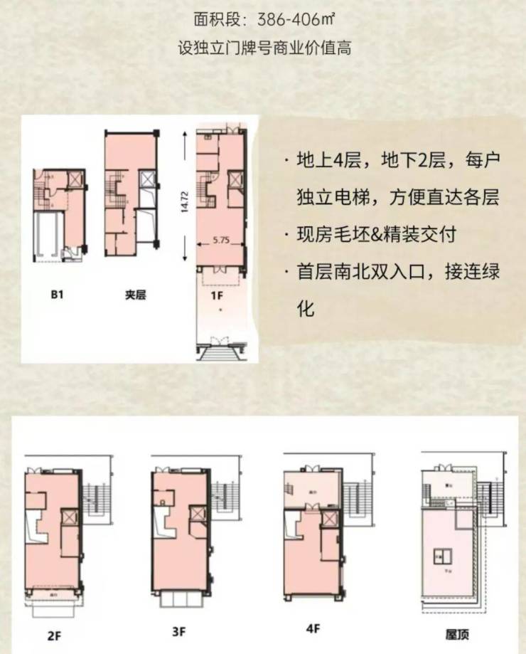 标准户型:地上4层(1~4层)、地下2层(夹层、B1层),多层商业空间,可灵活设计;外设独立门牌,内设独立电梯★,B1层可直达地下车库;首层设南北双门,连接绿化*;预设太阳能热水系统★。
