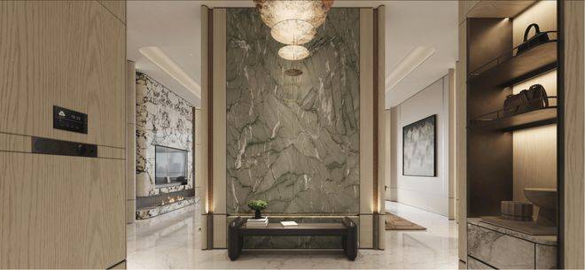 玄关处,在近5米的进口石材墙面上,不管是挂上收藏的名画,还是摆放淘来的艺术品,灯光一洗,立刻有了「私人博物馆」的范儿;