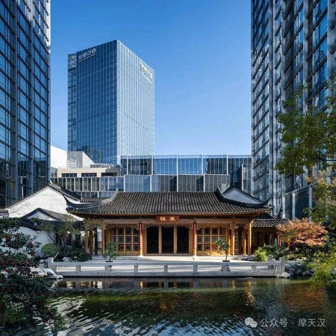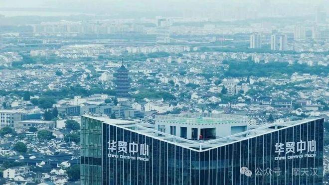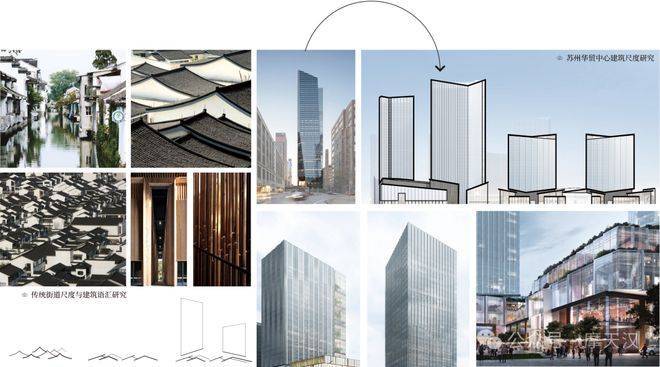 华贸中心的塔楼参照苏州传统建筑屋面,设置独特的缓倾斜屋顶轮廓。