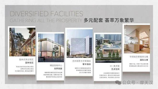 苏州华贸中心聚合了苏州万象天地、华贸超甲级写字楼、苏州丽思卡尔顿酒店、万豪旅享家公寓、姑苏里服务公寓酒店、丽璟公馆、华贸中心公寓、紫芝园、H+美术馆等多元业态,充分融合东方历史文化与大都会商业文明精髓,打造具有历史名城人文气息、面向未来的可持续发展平台,树立长三角商业新地标。