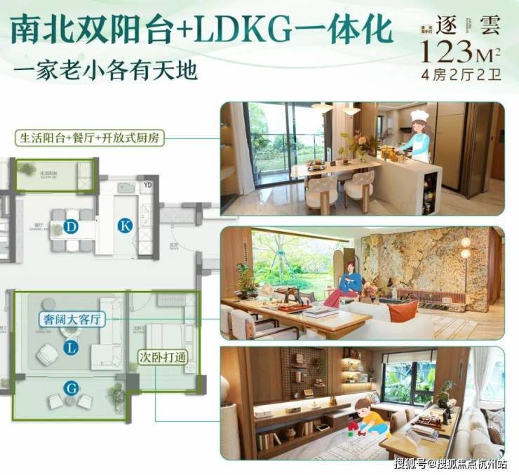 生活阳台将生活琐碎尽数收纳,而景观阳台则在封窗后, 实现真正的LDKG一体化,主人在厨房做饭、孩子在客厅玩耍、长者在景观阳台喝茶看风景,彼此都有自己的空间,岁月静好。