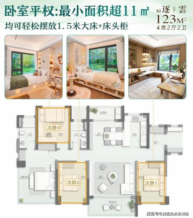 最让人心动的是,123㎡户型四个卧室,空间尺度均十分宽敞, 最小卧室面积超11㎡,轻松摆放1.5米大床加床头柜,毫无压力!