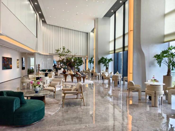 在设计语言上,浦江园融合传统东方美学元素,约百米尺度景观大门的坡屋面、踏水归家的檐口、会客的廊架,皆是对古典韵味的现代诠释。在材质运用上,浦江园引入玻璃、钢、石材,替代了传统竹木,既保留了文化深度,又赋予了空间时代活力。