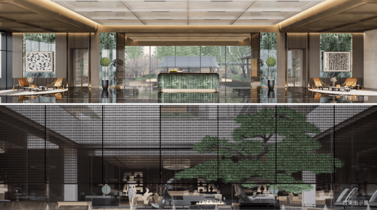 下沉式庭院,以古朴名贵的造型黑松,作为水景中的点睛之笔,营造出隐奢、静谧的艺术之境,定格场地的黄浦情怀。