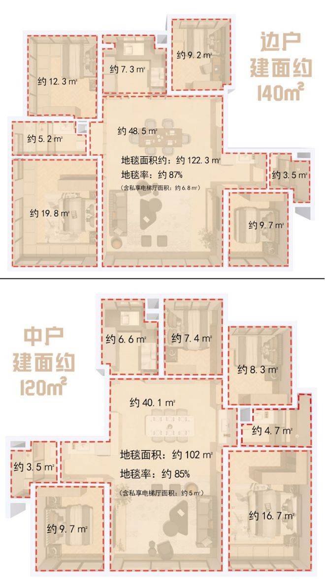加上全屋满飘窗和阳台的赠送——建面约120㎡户型地毯率约85%;建面约140㎡户型的地毯率更是高达约87%,在当下市场中,地毯率能够到达80%以上的产品已经是佼佼者了,而壹江臻邸项目首开两个户型的地毯率双双突破了85%,实属难得。