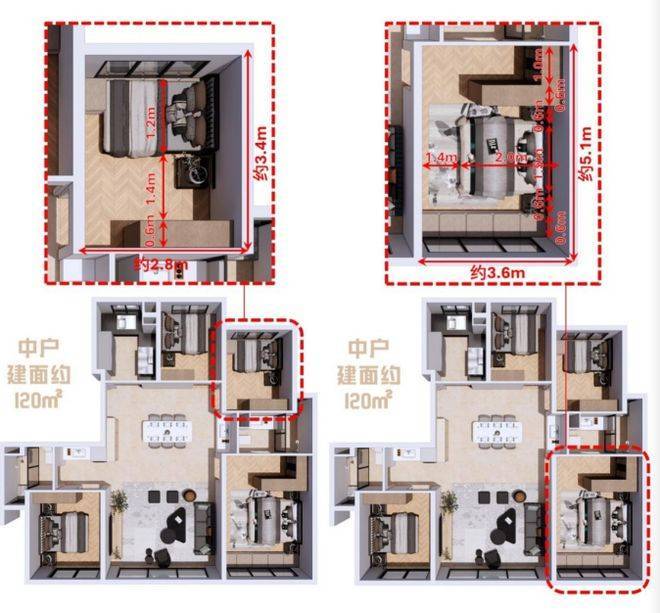 南向主卧轴线面宽约3.6m,南向次卧轴线面宽约3m,并且享有与140户型相近的进深尺度;北侧两个次卧轴线面宽分别约2.6m与2.8m,结合附赠的飘窗,亦可完美容纳“单人床+书桌+衣柜”的配置。