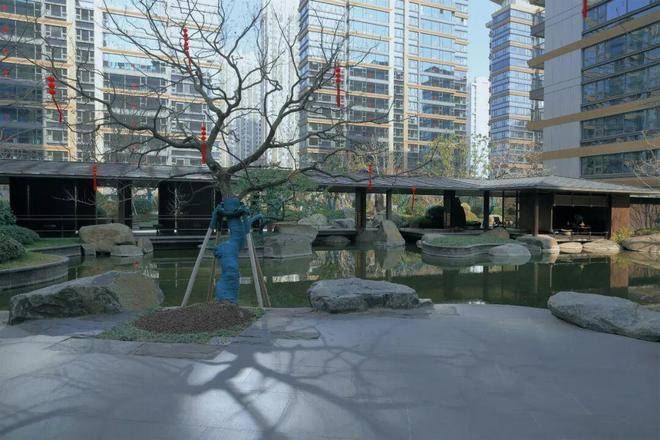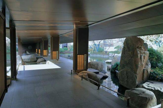 约 978㎡中心水景蜿蜒成 48m 特色水廊,水波荡漾间呼应《春江花月夜》中“春江潮水连海平”的悠远意境;