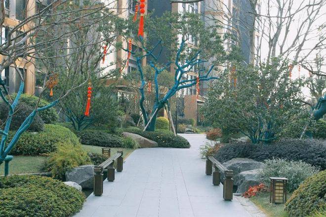 社区深度挖掘传统诗文与画作的美学内涵,以水景、亭台、廊架、景墙与植物为载体,打造可感可触的意境空间。
