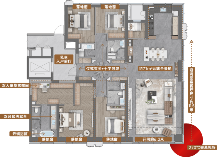 龙湖・山河颂建面约270㎡户型产品的突破,在于270°环幕观景设计——客厅与餐厅衔接的大面落地玻璃幕墙,形成约11.5米沿河面客餐厅观景尺度,将千年运河风光与半壁苏州的城市天际线完整纳入室内。