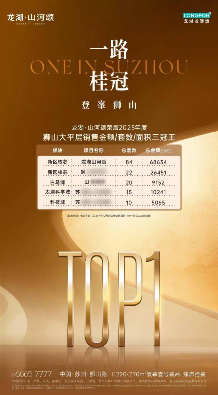 龙湖・山河颂自面市以来,持续领跑新区大平层市场,2025年1-12月荣膺销售金额、套数、面积三项TOP1(数据来源:悦天平台2025年1月-12月高新区190㎡及以上成交数据),市场热销数据印证了奢宅产品的核芯价值逻辑