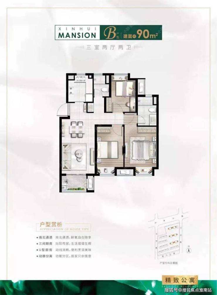 建面约94㎡3房2厅2卫户型特点:做到了三开间朝南+主卧套房设计+全卧飘窗+动静分离+卫生间干湿分离,功能性与空间感完美结合的3房“神户型”。