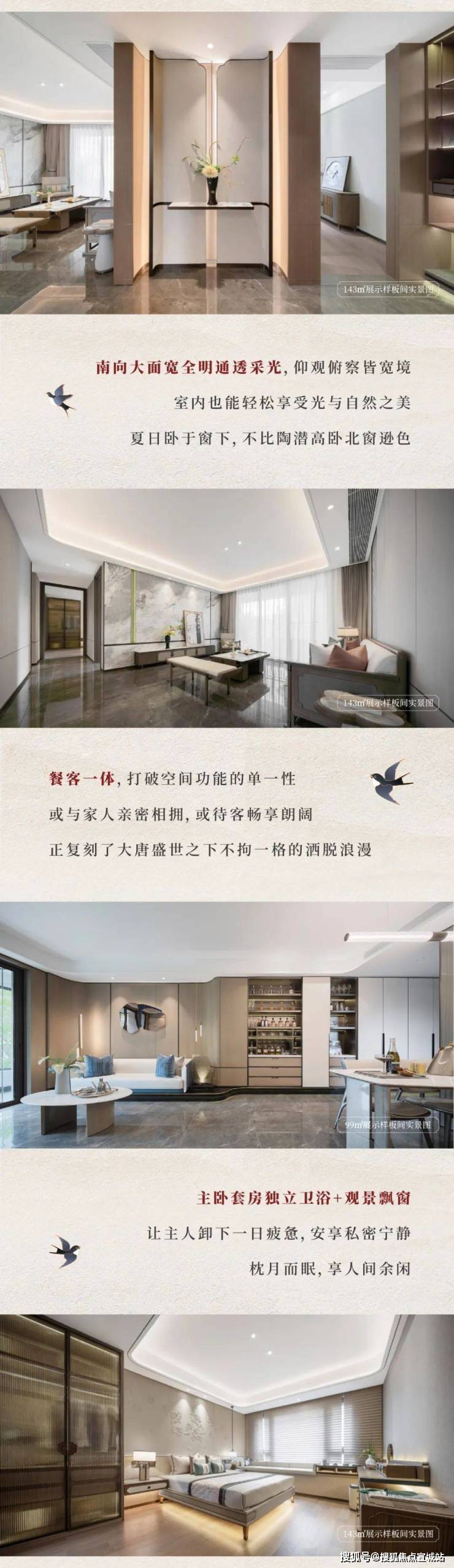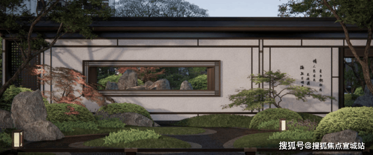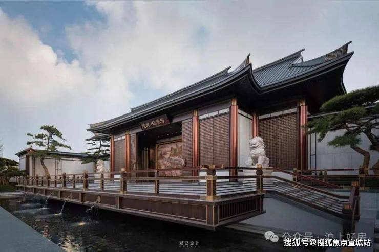 项目采用三段式入户:一进辋川入画(主入口空间),二进:闲庭碎影(戏台庭院),三进:临风听湖(自然庭院)。入户大门屋顶采用唐代“重檐歇山顶”形式配上台基上的唐代建筑标志阑干,入院后有一副唐风画作,其次以亭台楼榭、理水叠山的中国园林意境,重现盛唐大明宫百花争艳,小桥流水,落叶如金的景观。社区景观层层递进,让住户置身其中,体验唐风山水。