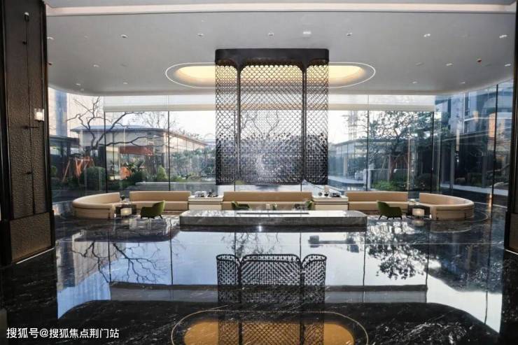 穿过华贵门廊,一境登门庭入府,超阔的接待前场是贝母形大理石地面铺贴纹路,头顶是透光云石弧形穹顶,正前方是皇室杈木影壁,接待台背部静置着“蓝翡翠”奢石背景屏风,以及与下沉水院一体的“三生石”造景,处处流露着优雅的艺术场域。