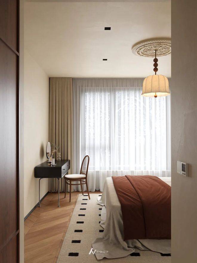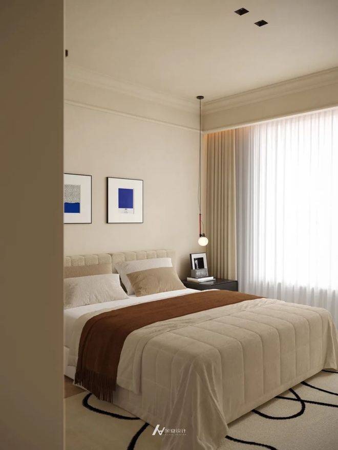 次卧以柔和米调为底色,营造静谧氛围。搭配同色系软包床头,浅棕床搭增添层次感。墙面双幅蓝白挂画点缀,打破单调。单侧悬浮床头柜简约实用,垂吊小灯设计精巧。大面积窗幔引入充足光线,地毯曲线元素柔化空间,整体布局简洁舒适,兼具温馨与雅致,适配休憩、客房等功能 。