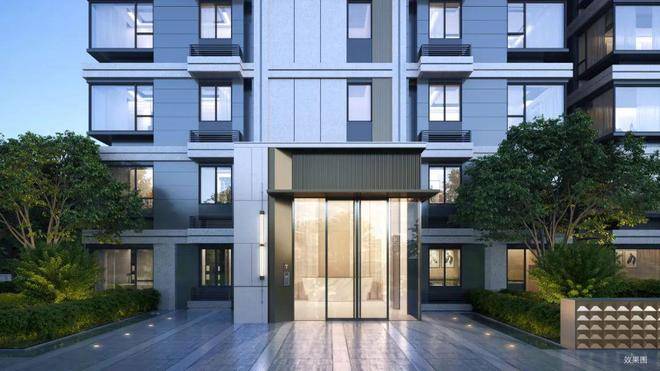 建筑风格融合现代简约与自然元素,外立面采用浅灰色真石漆、原木线条及玻璃幕墙,呈现“森居融合”效果。