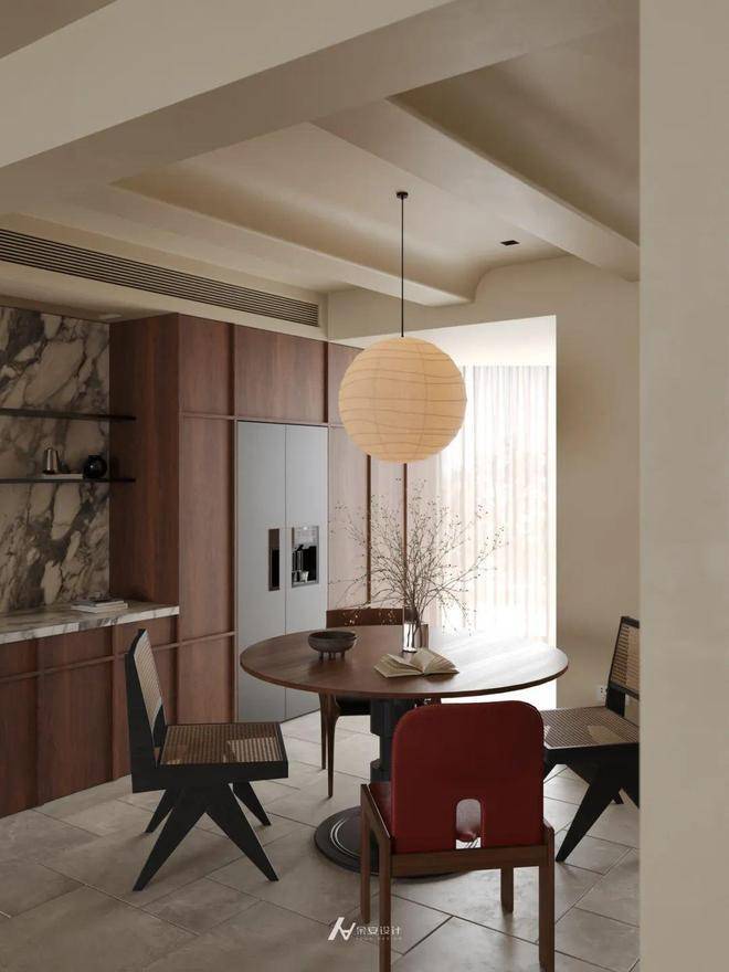 客厅、餐厅、餐厨区流畅贯通。客厅以壁炉营造温馨氛围,餐厅借圆形餐桌与球形吊灯构建聚合场景,二者通过顶面线条、地面材质(客厅人字拼地板/餐厅规整地砖 )自然过渡。餐厨区嵌入木质柜体与大理石背景墙,收纳与美观兼顾,各功能区既相对独立,又因开放格局深度融合,打造出互动性强、通透开阔的现代家居生活场景 ,让空间在视觉与使用体验上都更具延展性。
